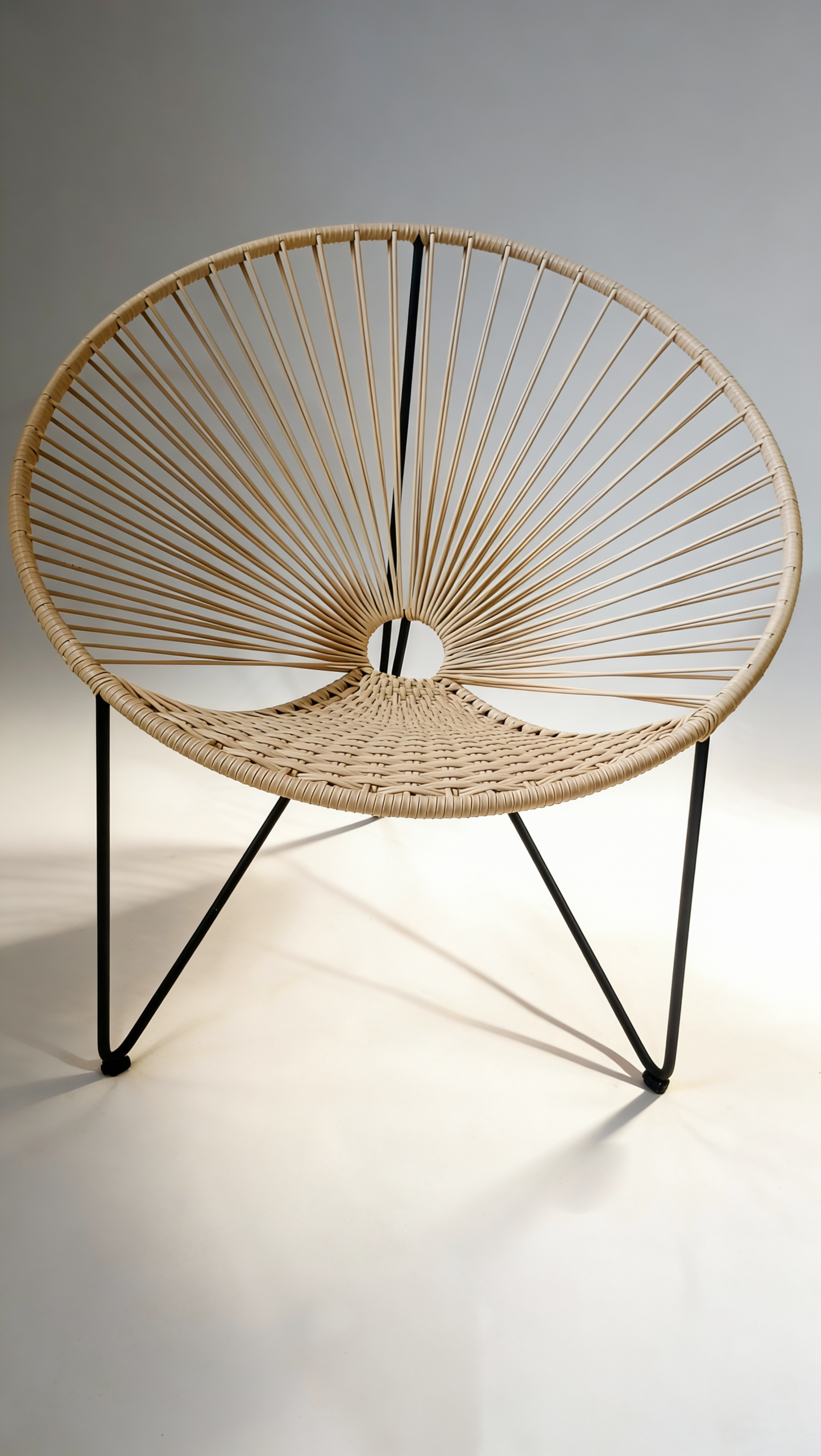 Estructura metálica, pintura electrostática, tejida a mano con mimbre pcv tubular filtro Uv, en Yaré o calceta de plátano.